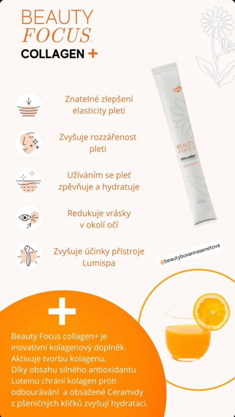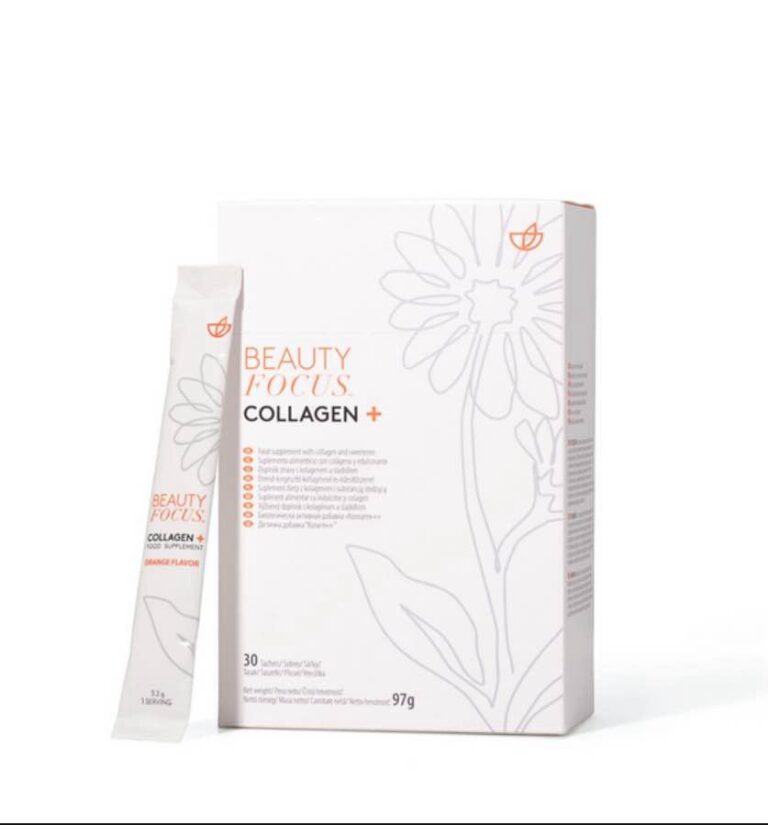 Beauty Focus Collagen+ je doplněk stravy pro krásu s klinicky dokázanými účinky na zdraví pleti. Viditelně pomáhá redukovat vrásky, napomáhá hydrataci pleti a posiluje tvorbu kolagenu a elastinu.